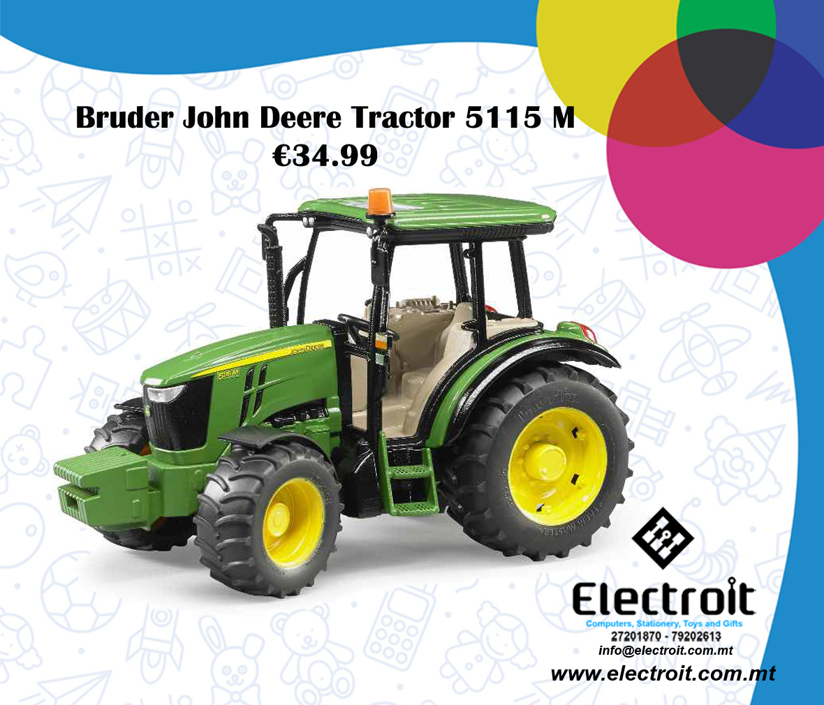 As an addition to the numerous John Deere items from BRUDER’s extensive range, the John Deere 5115M is now also represented. The model, which belongs to the 5M tractor series, impresses not only with its detailed appearance, but also with its compactness and maneuverability. Thanks to its particularly good maneuverability, it is ideal for working in tight spaces, for example, or for parking in the bworld machine shop without any complications. The large and clearly arranged driver’s cab is adapted to the bworld figures and enables them to navigate the tractor particularly well. As with all tractors from the BRUDER range, the John Deere 5115M can also be steered by means of the additional steering column stowed in the vehicle floor after it has been placed on the steering wheel through the sliding roof. The scale of 1:16 was also adhered to here in order to be able to build a particularly attractive playscape with many BRUDER products. The detachable front weight, in combination with the trailer hitch, makes it possible to pick up numerous attachments and trailers from the entire range. The functionality of the tractor can be expanded even further with the separately available front loader (item no. 02319).