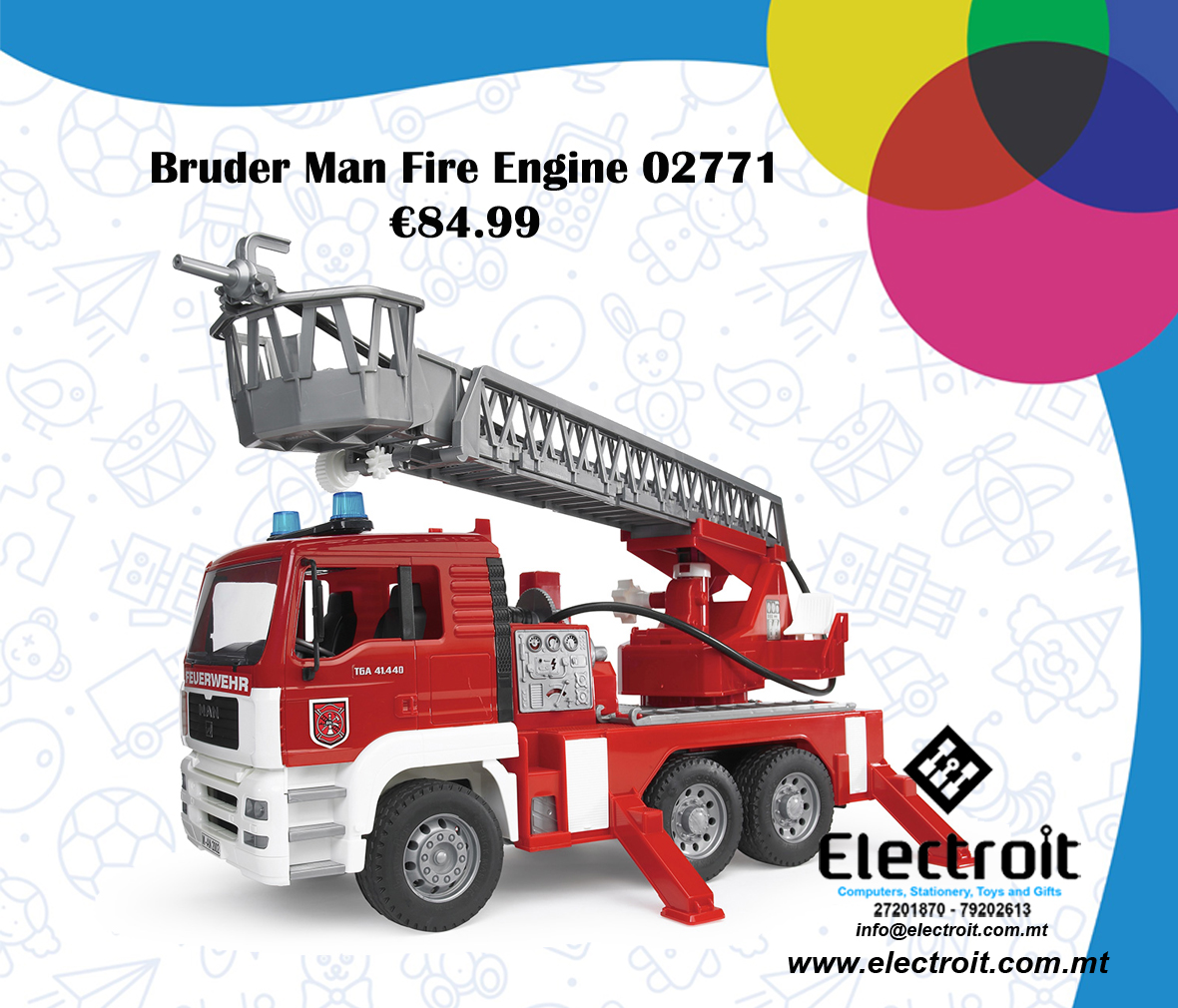 The tipping driver’s cab of the MAN fire service lorry with turntable ladder and water pump provides a view of the engine block. The wing mirrors of the driver’s cab can be folded out and the integrated water tank can be filled. The water hose can be coiled up and has a fully functioning water spray on the end. The turntable ladder with rescue basket can be moved out by a handwheel and adjusted in height. Four outriggers ensure stability. The Light and Sound Module (art. no.: 02801) with four different functions; horn, engine noise and flashing light and siren sound is included. Tread tyres complete the picture.