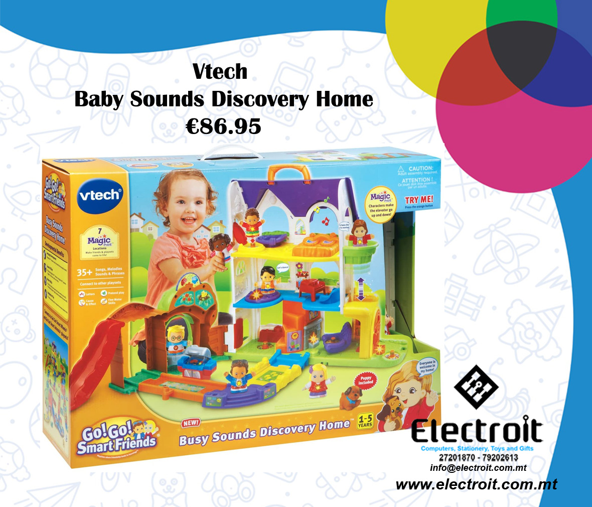 Explore the Go! Go! Smart Friends® Busy Sounds Discovery Home by VTech with Miss Norah and her dog! The interactive house features seven MagicPoint locations that encourage imaginative play and emphasize cause and effect relationships. Simply place Miss Norah on one of the MagicPoint locations to experience her friendly personality, motion, lights and more. Put Miss Norah in the elevator and watch as the elevator magically moves up and down. Activate the MagicChat feature in the playroom, and hear Miss Norah and other Go! Go! Smart Friends® characters (sold separately) chat and sing with each other. Miss Norah also responds to other MagicPoint™ locations on Go! Go! Smart Friends® accessories and playsets (each sold separately). Press Miss Norah’s light-up button, and she will come to life by introducing herself, sharing the things she likes to do and playing sing-along songs. Inspire the imagination and build an entire world by connecting to other Go! Go! Smart Friends®, Go! Go! Smart Wheels® and Go! Go! Smart Animals® playsets (sold separately).