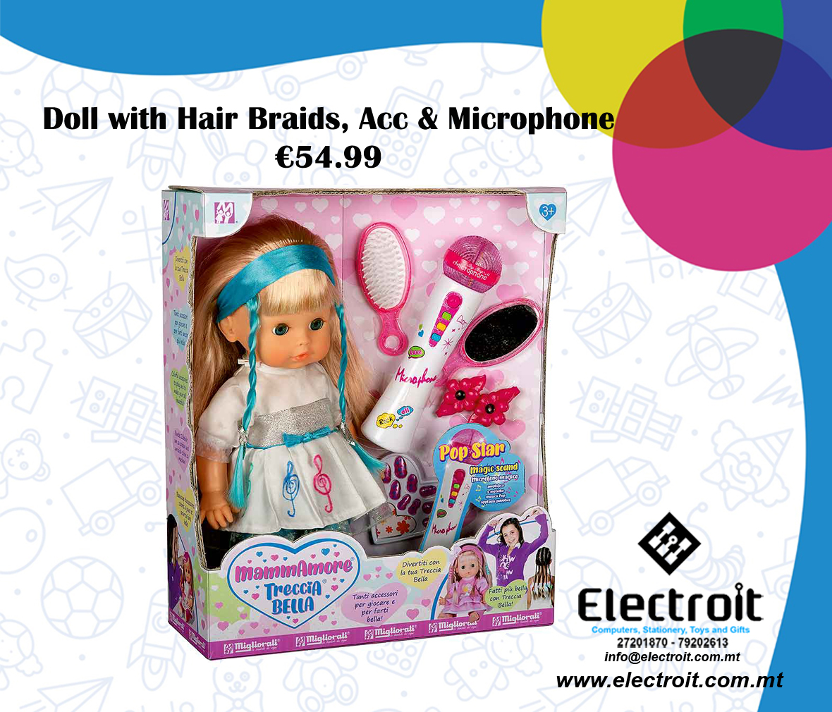 <span class="ts-tooltip button-tooltip" data-title="Add to compare">Compare</span>Doll with braids and long hair, including a microphone that really works (amplifies the voice, 5 melodies, pop music, audience applause) with comb and mirror.