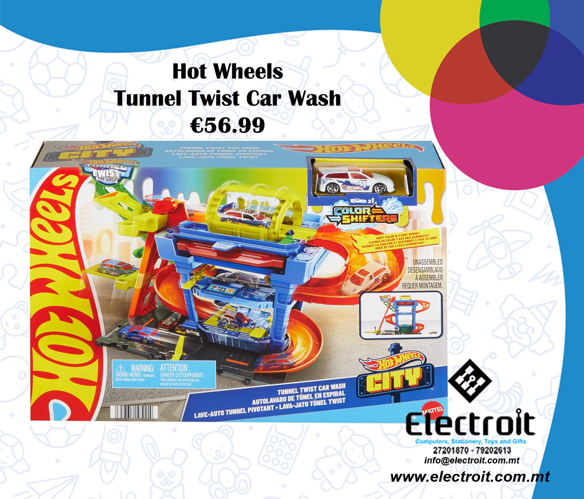 The Hot Wheels City Tunnel Twist Car Wash adds a twist to the color-changing action with an innovative water-spraying tunnel! Kids drive the include Hot Wheels Color Shifter car to the entrance where they take the kid-powered lift to the top floor. Drive into the rotating car wash tunnel where it gets doused in very warm water and see the car’s deco instantly change! Ride down the ramp through the foam roller and hit up the vacuum to complete the detailing. Finally, drop into the icy cold water dunk station where the car’s deco changes back to its original colors. Repeat again and again. Colors and decorations may vary.