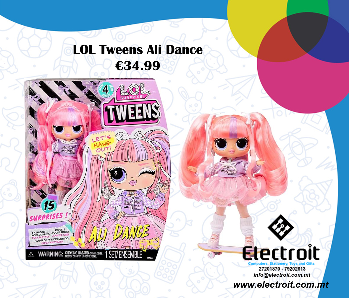 Introducing the all-new LOL Surprise Tweens fashion doll Ali Dance, big sister to adored character Center Stage! Unbox 15 surprises and watch Ali Dance in her element as she shows off her kickflips and tricks with her snazzy purple skateboard and her eloquent dance moves with her stylish pink top and skirt!