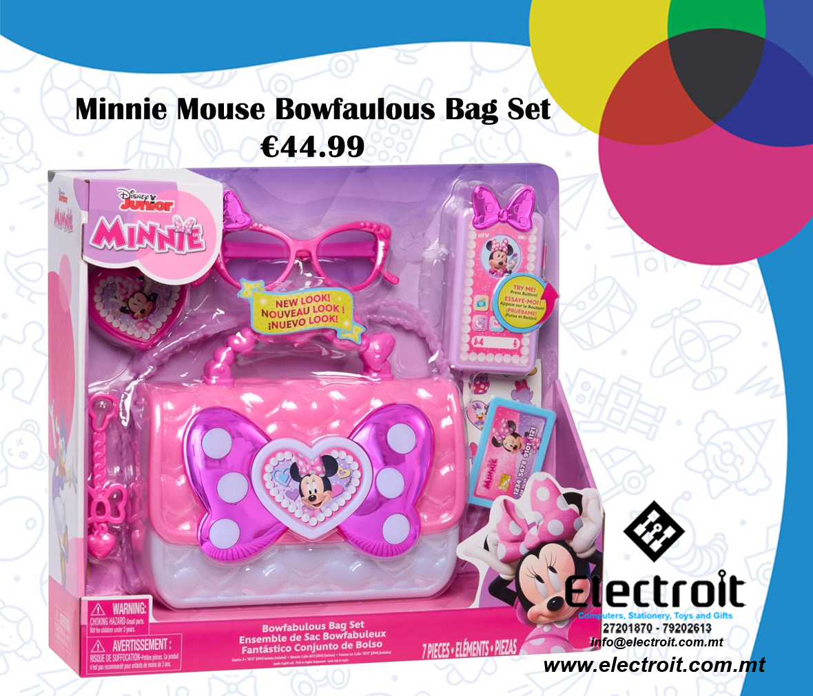 The Disney Junior Minnie Mouse Bowfabulous Bag Set has everything little fashionistas need to join Minnie Mouse and Daisy Duck on all adventures. This 7.32-inch-tall bag features a large bow with a special chrome-like finish for ultra-luxe looks. Inside, find a lights and sounds play cell phone, pink toy sunglasses, a play compact, a pretend credit card, a keychain, and a fun sticker sheet. Kids will have a great time pressing the button on the play cell phone to hear fun phrases from Minnie Mouse, while role-playing imaginative stories about tea parties, day trips, and weekend fun. Stow all included accessories inside the bag. A comfortable crossbody strap makes it easy to take this bag on-the-go. The play cell phone requires 3 x AG13 batteries (included). This beautiful toy purse makes an excellent birthday or anytime surprise for kids ages 3 years and up.