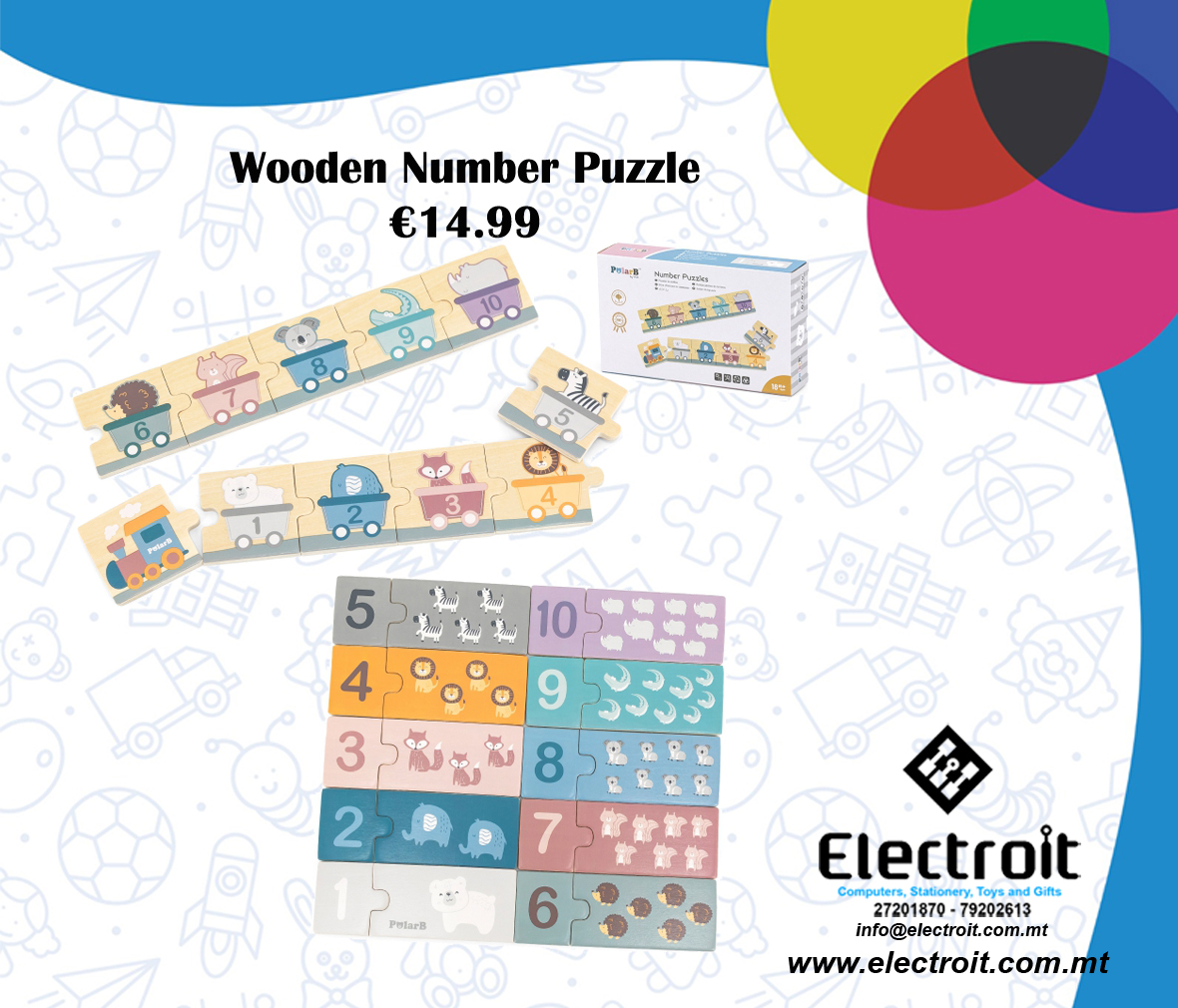 This digital puzzle contains 31 wooden pieces mixed with various animals and numbers. 20 pieces are puzzles with numbers from 1 to 10, to which a given number should be matched with the right number of drawn animals. Another 11 puzzles are a locomotive and 10 puzzles with animals in carriages with numbers from 1 to 10. The game consists in arranging carriages, e.g. from the smallest number to the largest, vice versa or in any other combination, e.g. carriages in the selected color. Puzzles will certainly help your child learn colors, numbers and develop manual skills.