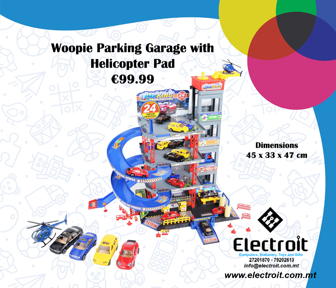 – set includes: 4 cars and a helicopter, parking lot elements, road signs, cones, parking lot access road elements, elevator and stickers,